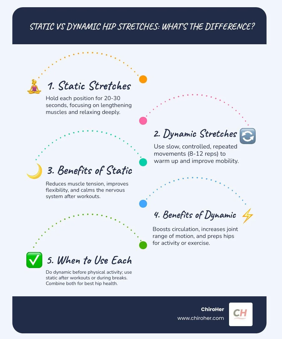 Static stretches are the ones you hold still, letting your muscles gently lengthen with each breath. For hips, these stretches usually work best when you hold them for around 30 seconds and focus on slow, deep breathing.