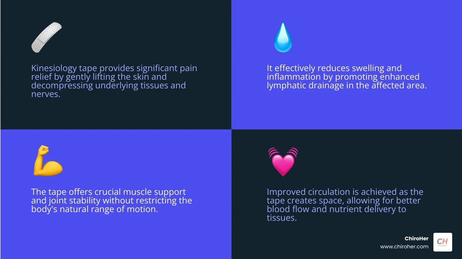 Circulation and Balance: Research has demonstrated that kinesiology tape increases blood flow to the skin. Some studies also found it improved dynamic balance in women with a history of falling.