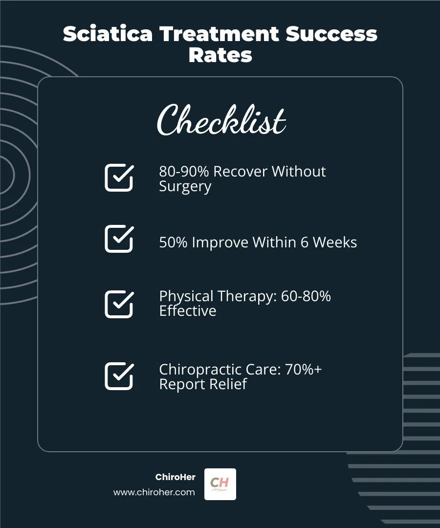 Research consistently shows that 80-90% of people with sciatica recover without surgery, and about half experience meaningful relief within six weeks. Most cases resolve completely within 4-6 weeks when you follow appropriate self-care strategies and treatment recommendations.