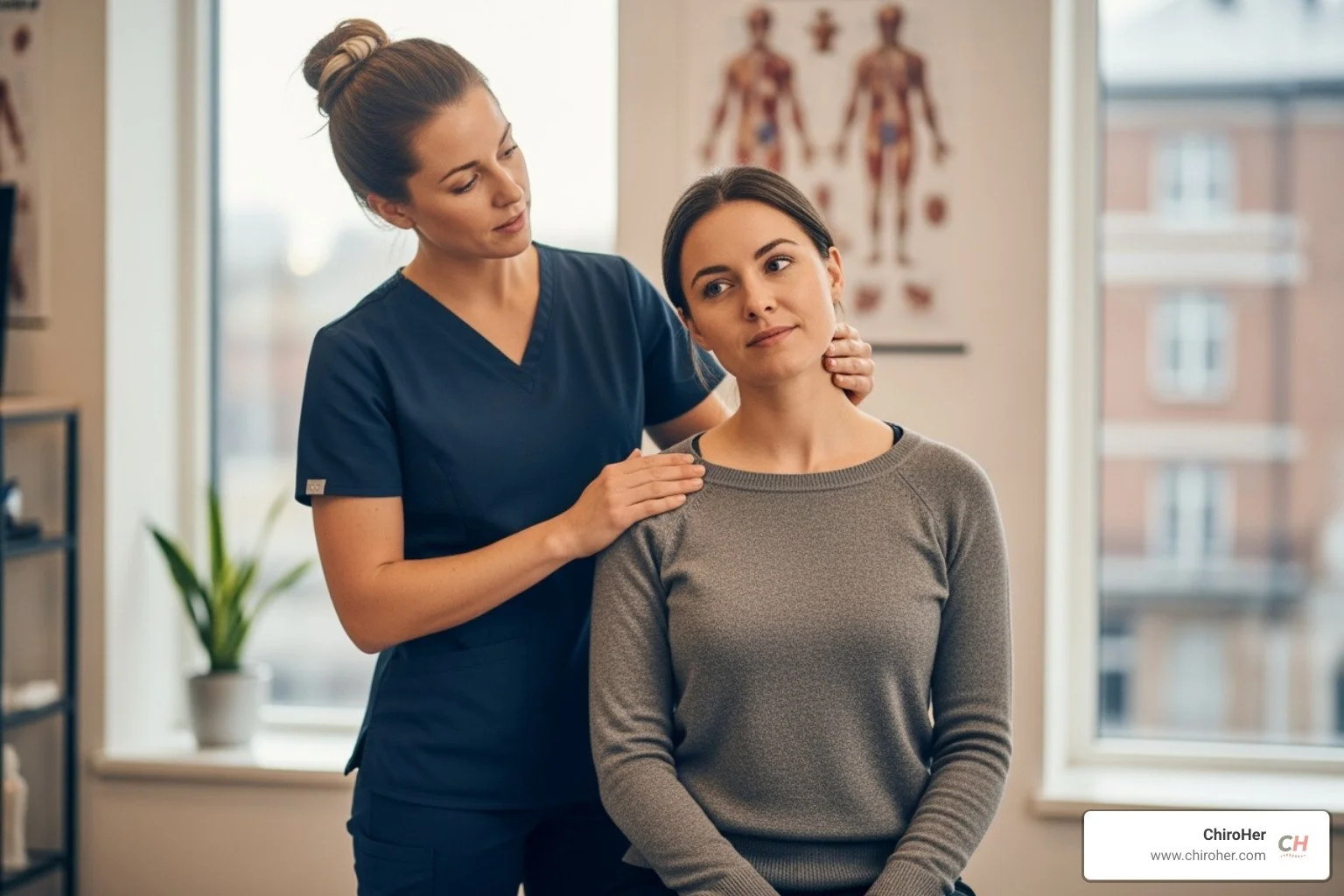 If you suspect you have a pinched nerve, getting a proper diagnosis is important. Our approach at ChiroHer begins with a thorough physical examination and taking a detailed medical history. We'll ask about your symptoms, when they started, what makes them better or worse, and any relevant past injuries or conditions. During the physical exam, we'll assess your range of motion in the neck and shoulders, check your reflexes, muscle strength, and sensation to pinpoint which nerve might be affected.