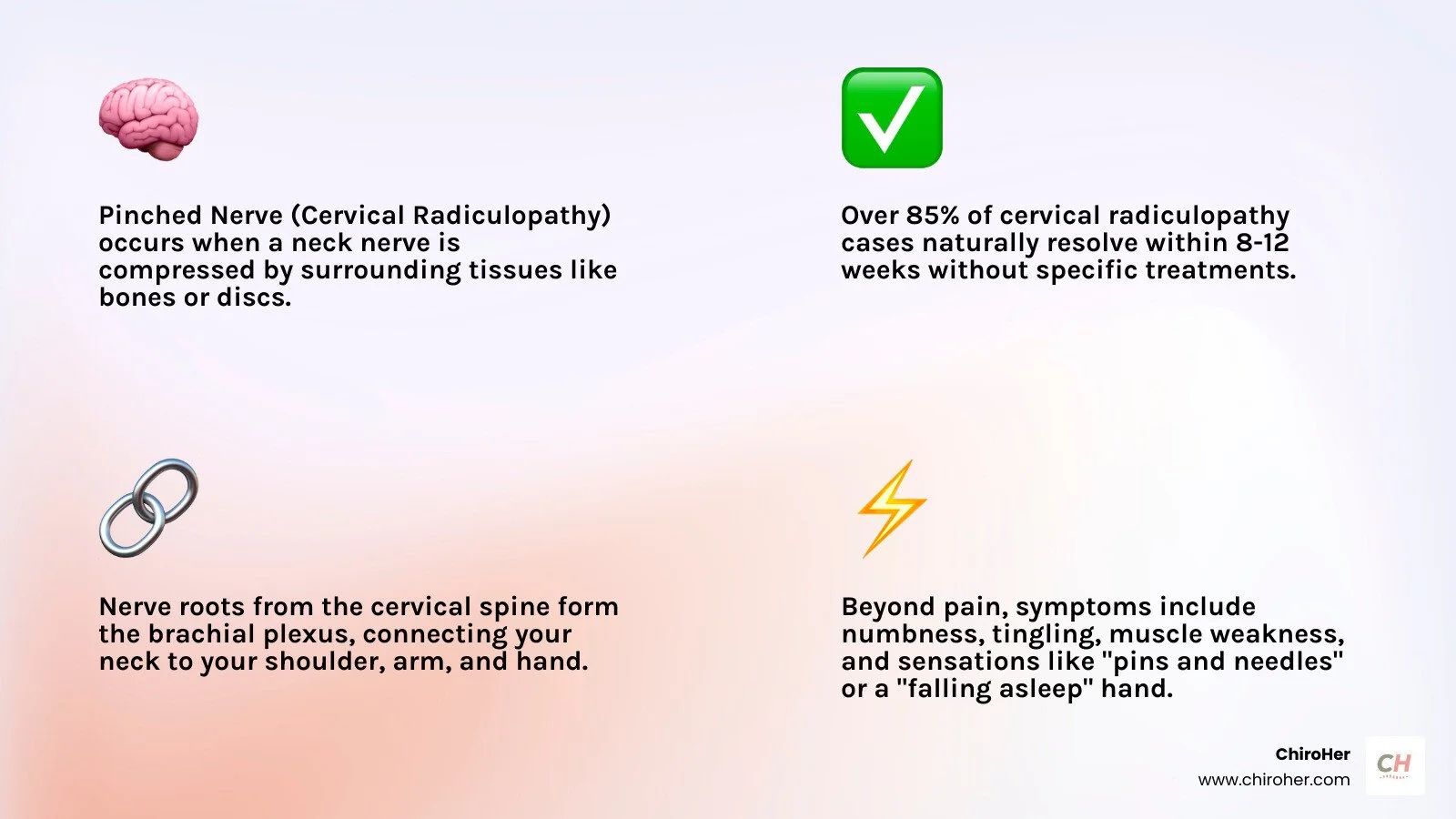 A pinched nerve in the neck, medically known as cervical radiculopathy, occurs when surrounding tissues like bones, discs, or muscles compress a nerve root as it exits the spinal cord. Research shows that over 85% of cervical radiculopathy cases resolve without specific treatments within 8-12 weeks, but recognizing the symptoms early can help you get relief faster.